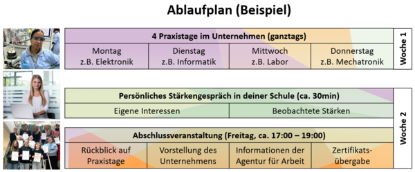 Im Anschluss an die Praxistage - in der Regel in der darauffolgenden Woche - finden zum einen die Stärkengespräche mit den Schülerinnen (in der Schule) und zum anderen die Abschlussveranstaltung (im Unternehmen) statt.